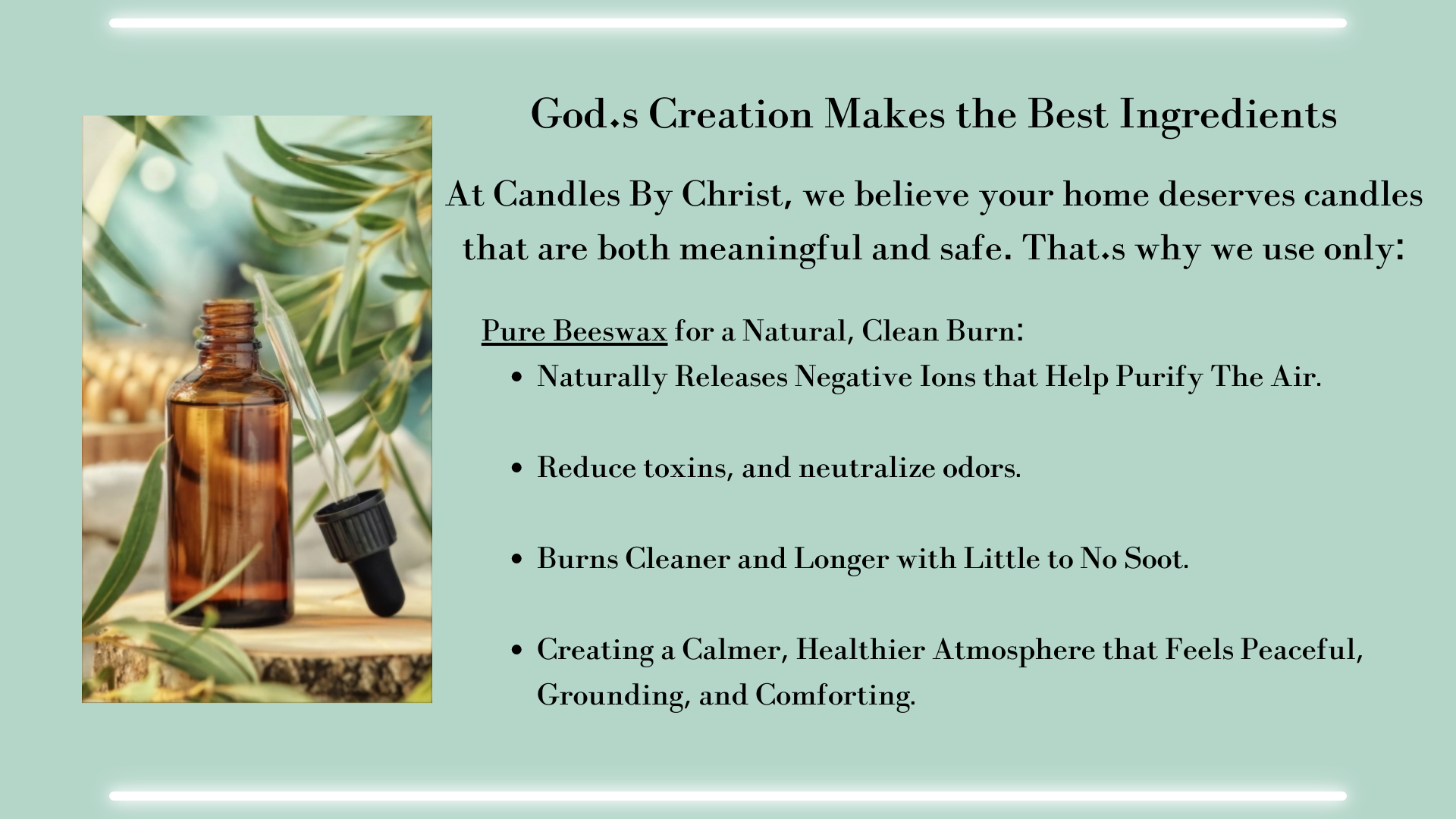 Candles By Christ was born from a love of God and a desire to create safe, meaningful candles for every home. Each candle is a reflection of light — a reminder of His presence, peace, and promises.